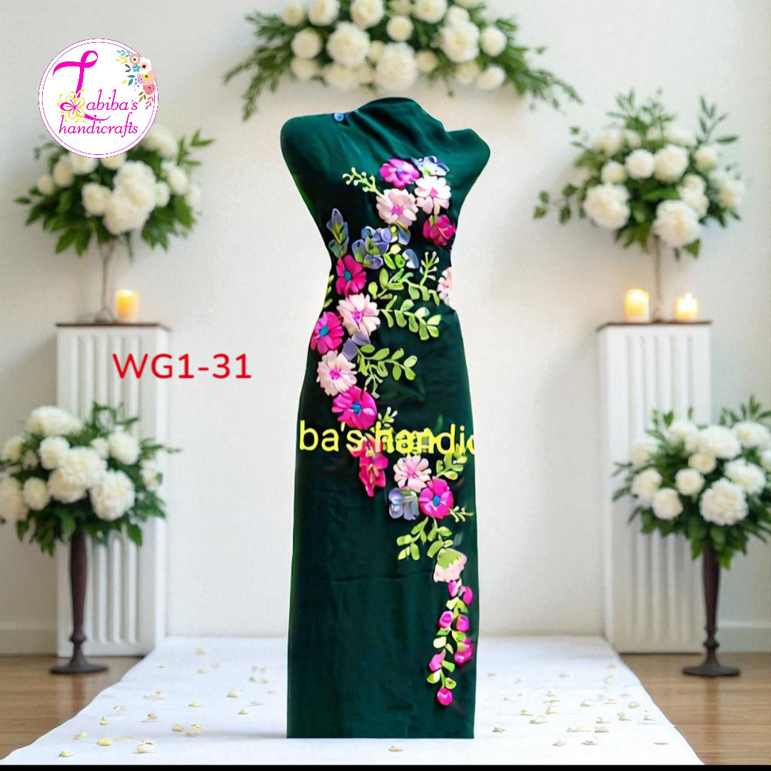 ওয়েটলেস জর্জেট কাপড়ে তৈরি এই সুন্দর ওয়ান পিসটিতে নিখুঁত হাতে করা রিবন ওয়ার্ক ব্যবহার করা হয়েছে, যা পুরো ড্রেসটিকে দিয়েছে নান্দনিক ও নজরকাড়া একটি লুক।